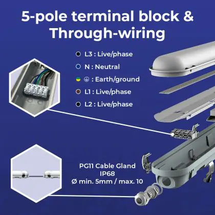 Descrizione Noxion Stagna LED Poseidon V3.0 19-33W 2340/4200lm - 830-865 CCT | 120cm - Cablaggio Entra/Esci (5x2.5mm2) - Emergenza 3H