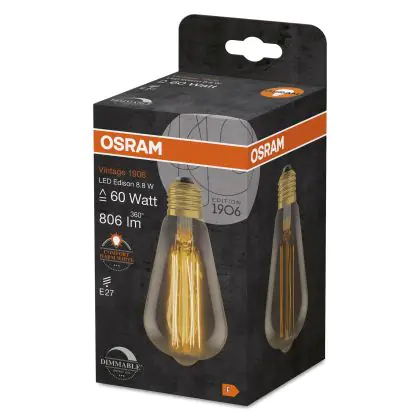 La Osram Vintage 1906 LED E27 Edison Filament Gold 8.8W 806lm - 822 Extra Warm White | Dimmable è la perfetta sostituzione per la tua lampada convenzionale 60W con attacco E27 grazie alla sua tecnologia LED. Passare a LED ti offrirà tanti vantaggi!