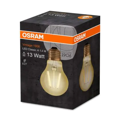 La Osram Vintage 1906 LED E27 Pera Filamento Oro 1.4W 120lm - 825 Bianco Molto Caldo | Sostitutiva 15W è la perfetta sostituzione per la tua lampada convenzionale 13W con attacco E27 grazie alla sua tecnologia LED. Passare a LED ti offrirà tanti vantaggi!