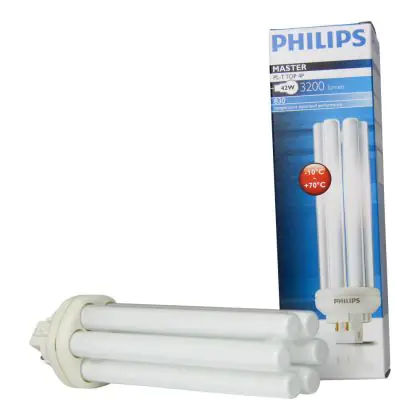 Le Philips PL-T TOP 42W 830 4P (MASTER) sono efficienti lampade fluorescenti compatte a basso contenuto di mercurio. Sono molto efficienti e garantiscono performance ottimali di illuminazione per periodi di accensione lunghi. Tali lampade fluorescenti compatte sono dotate di attacco GX24q-4 e la base presenta 4 pin (perni). La potenza delle stesse é pari a 42W. Quando sostituisci le tue lampade fluorescenti compatte é fondamentale scegliere le nuove con il medesimo attacco, numero di pin (perni) e potenza di quelle che stai attualmente usando altrimenti non sarai in grado di installarle.
